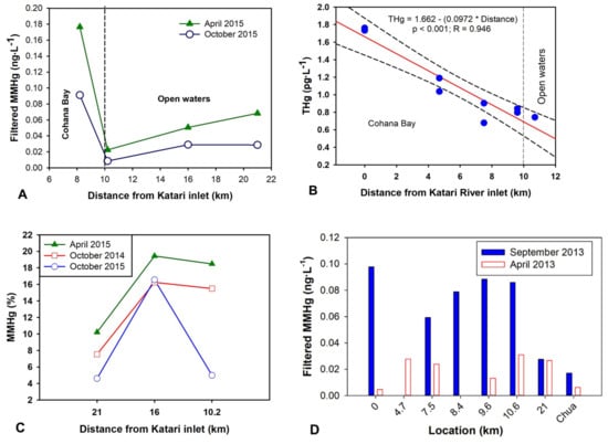 Filtered MMHg concentration in water increased at all sampled locations (up to 2.6 times) during the bloom (Figure 5A) compared to before and after the event. This rise is even more significant if we consider the dilution effect at the time of the bloom (i.e., end of the rainy season) compared to concentrations measured during the dry season (September or October) outside of the bloom (Figure 5D). These higher MMHg concentrations during the bloom are consistent with observed higher MMHg concentrations (51 pg∙L−1) found in the eutrophicated Cohana Bay compared to the open lake water (27 pg∙L−1) out of the bloom event. We also reported the same pattern for different lakes having contrasted trophic states in the TDPS system were the most eutrophicated areas showed the highest MMHg values [].