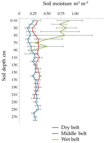 Soil moisture of the three belts (error bar = standard deviation (SD)).