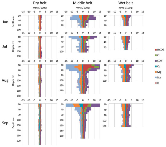 The chemical composition of these soils is also different (Figure 4). The highest content of anion and cation is observed in the soils of the middle belt, especially on the top of the profile. The wet belt has a lower but still high concentration of salts. The lowest anion–cation content is observed in the soils of the dry belt.
