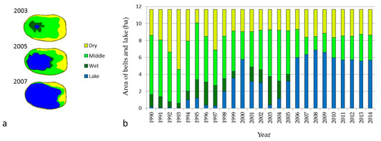 The wet belt consists of peat deposits formed under limnic conditions. Lacustrine sediments predetermine their carbonate saturation. The diagnostic feature of former formation in lakes is a lot of shells in the peat horizons. This soil has an alkaline reaction and hydrocarbonate sulfate salinization (Figure 4). The degree of salinity is lower than in the middle belt, due to high soil moisture and salt transport to the lake water [6]. Years of expanded lake promotes accumulation of various organic and mineral substances in lake water, leading to the maximum development of plankton in water and the accumulation of sapropel. The aquatic environment enriched with nutrients in turn contributes to the rapid development of hygrophytes on the coastal parts of the lakes, which, after dying out, accumulate in the form of peat. After the lake shrinks, the peat starts weathering and a new soil formation process begins [34]. The area of this belt changed from 0.68 to 3.36 ha during the observation period (Figure 5). Biomass productivity of the wet belt varied from 0.43 to 5.02 T/ha [38]. Thus, severe climatic conditions of Yakutia do not allow high productivity and high soil organic carbon (SOC) input, but the low decomposition rate of organic matter during the short summer promotes accumulation of high C stock in soils of the wet belt. Soil C content of wet grassland is the highest, two times that of the middle belt [6,7]. CH4 emission here is the highest and dependent on yearly climatic changes in the high range [21,30,32]. Flooding of lake water in thermokarst depressions is an important factor for CH4 production, some years causing an abrupt increase of CH4 emission [21,30].