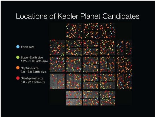Exoplanetary systems are very common. The statistical analysis of the results from the NASA’s Kepler mission has enabled sound estimates on the expected rates of occurrence of exoplanetary systems in the Galaxy; as an example, 16.5 ± 3.6% of the solar-like stars (stars with spectral type FGK) are expected to host planets with radii similar to Earth’s (between 0.8 and 1.25 Earth radii) and with orbital periods smaller than 85 days []. Kepler observed several wide fields on the sky during its 9.6-year mission lifetime and detected exoplanets by monitoring the intensity of stellar sources, to detect the flux decrements produced by the transit of possible exoplanets in front of the stellar disk. To be detectable, the inclination of the planet orbit must be close to 90° however, in spite of this constraint, the end of the mission budget of exoplanets found is 2662 exoplanets, a 69% of the 3875 exoplanets known today (Source: exoplanets.eu/catalog); these systems are uniformly distributed in the Kepler field, as shown in Figure 1.