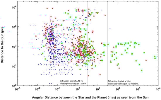 After this realization, there are two main lines of research: (1) characterizing exoplanets (atmospheres, composition, volcanic activity, magnetic fields…); and (2) observing Earth twins to investigate the emergence of life. Addressing these lines of research requires developing instrumentation to study faint objects located very close to bright (and variable) sources. The angular resolution required to resolve the exoplanets known to date is shown in Figure 2. The vast majority of them are at angular distances smaller than 10 milliarcseconds (mas) from their parent star. Most of the planets with masses below two times the mass of the Earth (2 ME) are angular distances below 0.1 mas from their parent star (see Figure 2). The angular resolution provided by diffraction-limited optical systems is proportional to the radiation wavelength, λ. A 10-m aperture telescope working in the infrared range (1.2 microns wavelength) may reach an angular resolution of 30 mas while at UV wavelengths (120 nm), the same aperture provides an angular resolution ten times better (3 mas). To achieve sub-mas resolution, either huge apertures are used or interferometric techniques are applied.