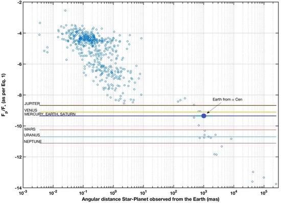 The Fp/F* ratios and angular distances of exoplanetary systems as per exoplanet.eu (in July 2018). The Fp/F* ratios are also plotted for Solar System planets. The bottom left source is WD 0806-661 b, one of the coldest known brown dwarfs (Teff = 300–345 K) [], included in the data base. Fp/F* ratios are given in logarithmic scale.