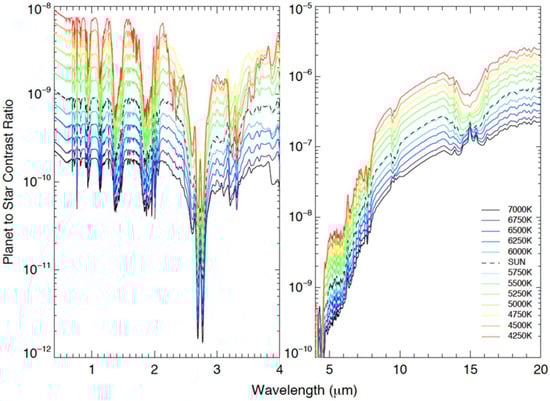 In Figure 3, the planet–star flux ratio in Equation (1) is represented versus the angular distance, as seen from Earth, for the planetary systems in the exoplanets data base (exoplanet.eu, contents by July 2018). Also, the parameters for the planets in the Solar System as seen by external observers are plotted. Moderate dynamical ranges (<106) are required to detect most of the exoplanets in the figure, provided high enough angular resolution is achieved. However, dynamical ranges larger than 109 are needed to resolve an Earth-like planet orbiting around a Solar-like star. This requirement depends on the wavelength and spectral type of the star. Planet to stars contrast ratio (Fp/F*) of Earth-like planets are shown in Figure 4 for an Earth-analogue cloud coverage (from []). From M-type to F-type stars, the requirement in terms of dynamical range varies by roughly two orders of magnitude.