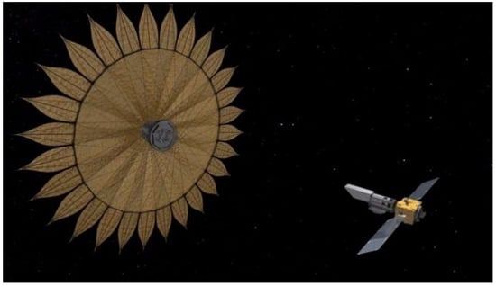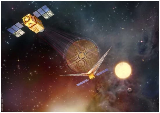 Starshades are external occulters that suppress the stellar radiation. They are flown in formation flying with a standard space telescope (see Figure 7) and, as the starlight is attenuated prior to diffraction by the primary mirror, they do not pose on the telescope optics as stringent requirements as coronagraphs [,,]. Neither starshades require active wavefront control to the telescope in order to achieve high dynamic range images at an inner working angle (IWAs).