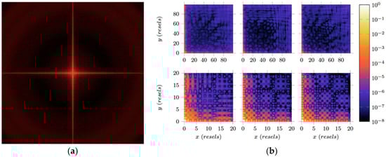 Figure 6. (a) Typical PSF at order 1 of a binary Fresnel zone plate for a square aperture; (b) Upper right quadrant of the PSFs of FIAs for various configurations (see [] for details). - Only 5% to 10% of the initial light is focused on the image plane. FI are radiometrically inefficient.