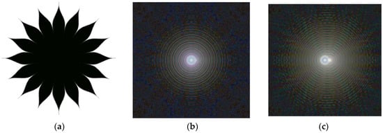 (a) The 16-petal starshade corresponding to the optimized solution in []; (b,c) Simulated images at the telescope’s image plane; RGB colors correspond to wavelengths 1 μm, 0.7 μm and 0.4 μm, respectively. (b): Planet at 60 mas. Parameters: R = 22 m, dS-T = 66,000 km; (c): Planet at 72 mas. Parameters: R = 25 m, dS-T = 72,000 km.