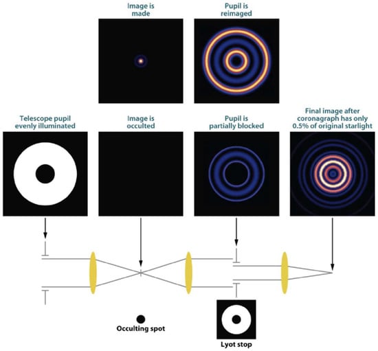 Coronagraphs are currently routinely implemented in imaging telescopes to block the input flux from bright sources and allow observing nearby faint objects. The larger the telescope, the more photons are collected from the planet, but also more challenging is the coronagraph design. There are several means to block the bright source radiation. In phase coronagraphs and vortex coronagraphs the blockage is produced by a mask that modifies the phase of the bright source, later to be eliminated by destructive interference. Band-limited coronagraphs are the preferred option for space telescopes and already implemented in the Hubble Space Telescope and in the JWST []. In these systems, the mask is designed to block radiation over a given wavelength range and manage the diffraction effects caused by mask using Lyot stop’s (see i.e., [] for a mathematical description of these systems and [], for a review). The basic optical layout and performance of these systems is shown in Figure 9.