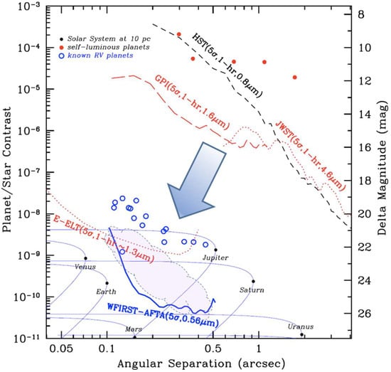 - Beichman, C.A.; Krist, J.; Trauger, J.T.; Greene, T.; Oppenheimer, B.; Sivaramakrishnan, A.; Doyon, R.; Boccaletti, A.; Barman, T.S.; Rieke, M. Imaging Young Planets from Ground and Space. Publ. Astron. Soc. Pac. 2010, 122, 162. [Google Scholar] [CrossRef]