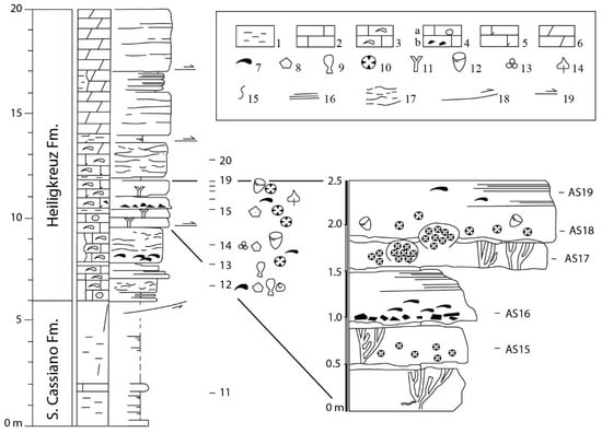 Stratigraphic section at the boundary between San Cassiano Fm and Heiligkreuz Fm on the road that cuts near Rifugio Vallandro with the location of the studied samples (modified from [36]).