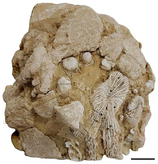 Several authors supplied the paleontological and taxonomic features of the frame-builders and reef-dwellers from Alpe di Specie [36,53,54,57,58]. The assemblage is composed of frame-building organisms dominated by few taxa (mainly sponges and corals), associated with subordinate encrusting and dwelling fauna [36].