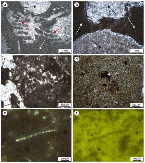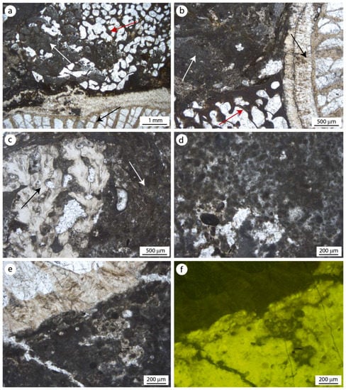 Main microfacies of the Alpe di Specie erratic boulders. (a,b) Boundstones made of corals (black arrows), sponges (red arrows), and autochthonous micrite filling the intra- and extra-skeletal cavities (white arrows). (c) A red alga, Dendronella articulata (black arrow), surrounded by autochthonous micrite. (d) Autochthonous micrite showing peloids or clotted peloids. (e,f) Autochthonous micrite (bottom right) and a portion of corallite wall (top left) observed in incident light (e) and Ultraviolet (UV) epifluorescence (f); the high fluorescence reveals the high organic matter content inside the microbialite.