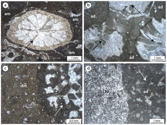 The small coralgal patch reefs of Alpe di Specie developed in the relatively muddy low-energy environment, see Figure 2. The primary skeletal framework of these bioconstructions was poor in early cement and the diffused cryptic cavities hosted microbial communities fed by the decaying organic matter [58]. The microbial metabolic activities favored the precipitation of autochthonous micrite (microbialites). Peloidal to clotted peloidal and aphanitic micrite fills most of the intra- and inter-skeletal cavities contributing to the syndepositional cementation and stabilization of these bioconstructions, see Figure 6. These micrite types were commonly associated with anaerobic bacteria thriving in cryptic cavities characterized by suboxic to anoxic conditions [61,62,63,64,65,66,67,68,69]. Recently, microbial activity, inducing biomineralization processes in modern cryptic environments, was recognized in bioconstructions growing on submarine caves [70,71,72,73,74]. Biomarkers, with a high specificity of sulfate-reducing bacteria, are indicative of a univocal microbial process mediating the precipitation of microbialite in the marine caves [75,76]. Similar microbial processes were inferred for the deposition of autochthonous micrite inside the small cavities of the Triassic patch reefs. These coralgal patch reefs contain sulfate reducing bacteria (SRB) biomarkers, lack specific molecules typical of cyanobacteria, and have Rare Earth Elements (REE) values indicative of suboxic conditions [58,77,78,79].