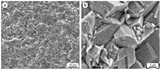 SEM pictures showing the crystal size and shape of the aphanodolomite (a) and finely crystalline dolomite (b).