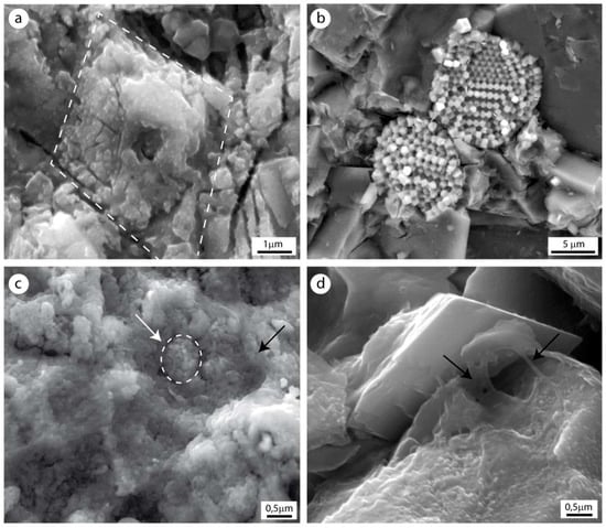 Traces of organic matter in the aphanodolomite are also confirmed by the amorphous substance, see Figure 10c,d, and the micro-spheroidal corpuscles, see Figure 10c, observed with SEM. The amorphous substance could represent remains of mineralized extracellular polymeric substance (EPS) while micro-spheroidal corpuscles could represent remains of bacterial mineralized bodies.