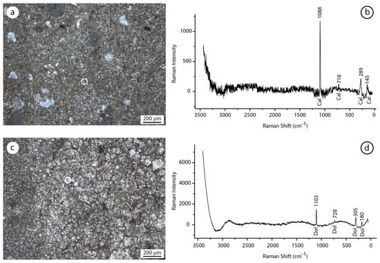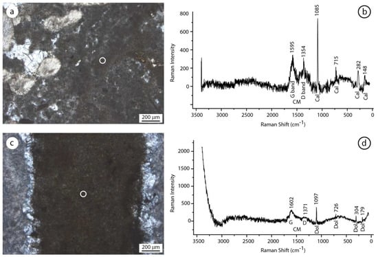 The spectra on detrital and autochthonous micrite of the erratic boulder samples show the typical calcite bands. The four prominent absorption bands of the calcite were recorded at 148, 282, 715, and 1085 cm−1, as shown in Figure 11a,b. Minor shifts of the positions between the analyzed samples and the spectra published in the literature could be due to the natural impurities of the samples [59,60]. The studied samples show distinctive peaks around 1595 cm−1 and 1354 cm−1, related to the presence of G and D bands of the amorphous carbon (AM). These bands were recorded in the fluorescent autochthonous micrite, regardless of the texture type (peloidal or aphanitic). The organic G and D bands were not present in the spectra of non-fluorescent allochthonous fractions, see Figure 12a,b.