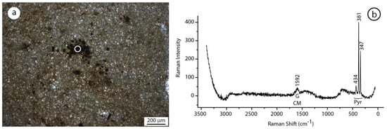 (a) Aphanodolomite with framboidal pyrite. (b) Raman spectrum showing the typical picks of the pyrite. Note the association of the pyrite with graphitized carbonaceous material remain testified by the G band.
