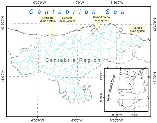 The region of Cantabria is located on the northern coast of the Iberian Peninsula, where the Atlantic Ocean is regionally known as the Cantabrian Sea (Figure 1). In general, this section of the Spanish coast has a cliff-like morphology, with an abrupt coastline, in which small-sized beach systems are developed and, in many cases, their development and location depend on the geology of the area. These beach systems present a greater development when their location coincides with the large river mouths on this stretch of coast. The contribution of sediments of fluvial origin allows for greater beach development, which in many cases results in beach-dune systems. These dune systems, whose orientation and development are influenced by coastal drift currents (usually from W to E), close in and protect the estuaries that develop at the mouths of the river channels.