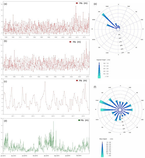 These sections of the coast have a mesotidal range (with an average tidal range close to 3 m), with maximum values around 5 m at high tide. The wave system is characterized by Hs (significant wave height) values around 2 m and Tp (wave peak time period) values between 8–12 s. The maximum Hs value recorded in the historical data (1958–2018, Figure 2a–d) is close to 12 m, although the maximum annual average value is slightly above six meters in height. It is observed from this historical record of Hs values that the maximum monthly Hs value has exceeded eight meters only six times; five of these events occurred after 2007. The wave direction in open water is mostly from the NW (around 80%, Figure 2e), and the other main components come from the W, N, and NE. The dominant wind directions show greater variability, although the W-NW quadrant (Figure 2f) accounts for around 30% of the measurements.