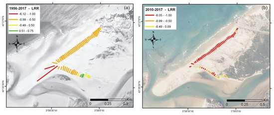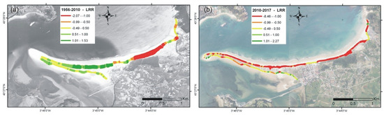 DSAS results for the Linear Regression Rate (LRR) statistical parameter (m year−1) at the Liencres dune system, for the entire time period (a) and post-storm period (b).