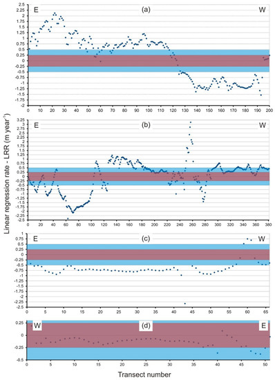 In order to carry out the analysis of the shoreline’s historical evolution in the dune systems, the results offered by the DSAS software have been classified into five intervals: high accretion (>1 m year−1), moderate accretion (0.5–1 m year−1), mainly stable (0.5–−0.5 m year−1), moderate erosion (−0.5–−1 m year−1), and high erosion (<−1 m year−1). From the results, it is observed that the distribution of zones with erosion, stability or sedimentation does not vary significantly when using the EPR or LRR rate for the analysis (although there are differences in the estimated value rates for each statistical parameter).