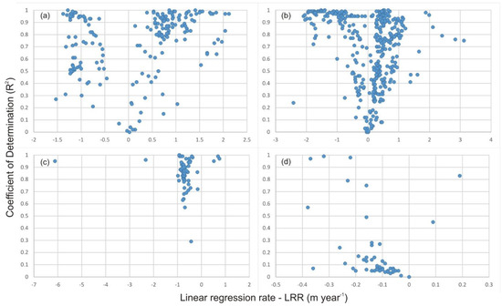 Relationship between the LRR statistical parameter and its coefficient of determination (R2) for the dune systems analyzed: Laredo (a), Somo-Loredo (b), Liencres (c), and Oyambre (d).