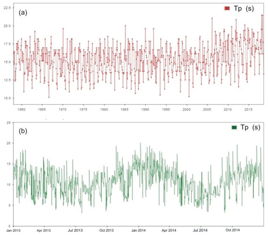 Maximum monthly value (a) for the wave crest time period (seconds), Tp; and hourly values (b) of Tp variable in the 2013–14 winter season.