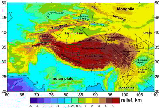 Starting from the 1980s, numerous tomographic surveys have been carried out to investigate a deep structure in the Himalayas and Tibet [,,,,,]. For a more detailed overview of these studies, we refer readers to [] and further in Section 2.2. Despite this effort, large parts of this region are still not yet sufficiently covered by high quality seismic data mainly due to its remoteness and extreme climate. These practical limitations could partially be mitigated by using global gravity and topographic data to investigate the lithospheric structure where seismic data are sparse or missing.