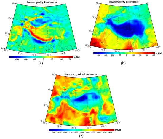 Regional gravity maps: (a) the free-air gravity disturbances, (b) the Bouguer gravity disturbances, and (c) the isostatic gravity disturbances.