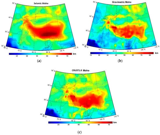 Moho models of Tibet: (a) seismic, (b) gravimetric, and (c) CRUST1.0.