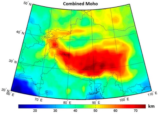 A Moho depth largely between 60–70 km beneath most of the Himalayas and Tibet was reported in []. These values closely agree with our findings. Their result, however, indicated that the maximum Moho deepening of ~79 km occurred in the northern Tibet and the Himalayas. A maximum Moho deepening in northern Tibet along margins with the Tarim basin was also reported by []. According to their estimates, the Moho was more than 65 km deep under most of Tibet with maxima of ~82 km in its western part. A different Moho topography was presented by []. According to their result, the Moho depth in the west was deeper than that in the east, and the deepest Moho of ~77 km occurred beneath the western Qiangtang block. They also identified a Moho offset of approximately 5 km beneath the Yarlung-Zangbo suture at the juncture between the Himalayan and Lhasa blocks. Our combined Moho model also differed from the result presented by []. According to their result, the Moho depth under most of Tibet was largely within 70–75 km with the maximum deepening to ~80 km along margins of the plateau and a shallower depth of 65 km under the Bangong-Nujiang suture in central Tibet.