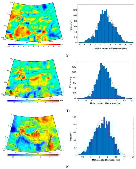 The seismic Moho model (Figure 3a) exhibited a relatively smooth spatial pattern, partially due to the interpolation on a regular grid in areas where seismic data were sparse or missing. The Moho depth under the Indo-Ganges basin was mostly within 40–50 km. A similar Moho depth was found under the Tarim and Sichaun basins. The Moho depth in the Quadam basin exceeded 50 km. Major geological margins between orogens and basins were well pronounced with a significant Moho deepening under orogens. The orogenic belt of the Himalayas, Tibet, and Hindu Kush was characterized by a Moho depth exceeding 60 km and reaching the maximum depth of almost 76 km in the south and central Tibetan Plateau. This deep Moho extended eastwards under the western parts of the Hengduan Mountains. In contrast, the Tien Shan orogen was only slightly pronounced with the Moho depth reaching 52–56 km. The gravimetric Moho model (Figure 3b) revealed a more complex spatial pattern. Again, we could recognize a different crustal thickness of orogens and continental basins, but in this case, margins between geological provinces were much less pronounced in the Moho geometry. According to the VMM isostatic model applied in this study, the maximum Moho depending of ~86 km was detected under the Hindu Kush. Similarly, the maximum Moho deepening occurred there according to the CRUST1.0 seismic model (Figure 3c), but in this case to only ~75 km. The significant CRUST1.0 Moho deepening was also detected in parts of the south and central Tibetan Plateau.