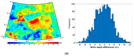 A principal theoretical deficiency of gravimetric methods for a Moho recovery is that the compensation depth does not necessarily agree with the Moho depth detected from the seismic data analysis []. This is particularly relevant for active convergent tectonic margins along the Himalayas []. Even possibly more stable orogenic structures in Tibet could isostatically be either under- or over-compensated []. Moreover, the isostatic mass balance not only takes place within the crust, but eventually within the whole lithosphere, while also reflecting the lithospheric density structure []. Another important aspect limiting a practical use of gravity data is the existence of some complex features in the Moho geometry detected from seismic data that cannot realistically be modeled by applying isostatic schemes. The work in [], for instance, demonstrated the existence of a progressive bending of the Moho in the west-east direction across Tibet. The work in [] indicated that a Moho structure beneath Tibet can be very complicated and has strong lateral variations. They also suggested that a detailed mapping of the Moho topography is only possible with 2D dense seismic experiments. Since the Moho locally deepens perpendicular to the direction of the Indian plate motion, [] proposed that the lower crustal deformation is decoupled from the underlying Indian mantle lithosphere. More recently, [] demonstrated a significant segmentation of the lower crust in western Tibet. Such factors often cause large discrepancies between gravimetric and seismic Moho models. According to [], these differences in China are mostly within 3–5 km, but locally could reach (or even exceed) 15 km, especially in the Himalayas and Tibet.