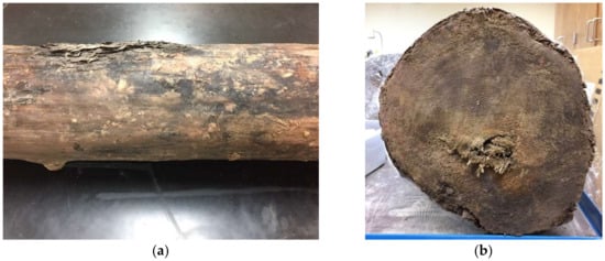 Subfossil spruce wood (Picea) from the Two Creeks Buried Forest in northeastern Wisconsin, USA showing no significant desiccation cracking, despite storage in the laboratory for over two years in plastic wrap. Locality is the Ebben Quarry near Green Bay, Wisconsin (44.440279° N, 88.173981° W) and is a confirmed Two Creeks site by Hooyer and Mickelson []. (a) View of outside of log. Scaly portion at top left is a remnant of the original bark. (b) View of transverse section showing lack of desiccation cracking. Log diameter is 26 cm.