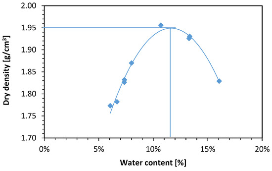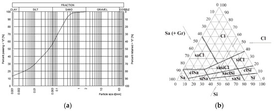 In order to determine granular composition, the aerometric method was applied. Based on granular structure, determined by the aerometric method, the soil was classified as sasiCl (sandy silty clay, according to PN-EN ISO 14688:2006 [33] standard, based on international standards). The results of the gradation analysis tests are presented Figure 1.