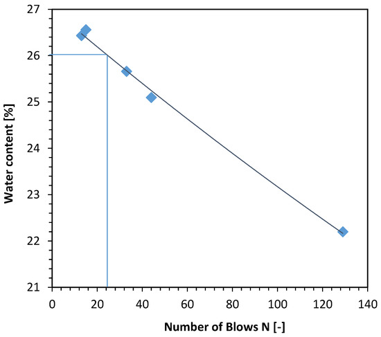 In the next step, the Atterberg limits were examined. Plastic limit was determined by rolling a portion of soil into a ball with 7 mm diameter. Afterwards, sample should be rolled into a thread with 3 mm diameter. When cracks were observed, sample’s weight was tested and then sample was dried in 105 °C for 24 h to determine moisture content. Examined soil sample’s plastic limit (PL) equals 13.71%. Liquid limit (LL) was examined using Casagrande cup and equals around 26.0% (Figure 2). The plasticity index (PI) of this soil is equal to 12.29%.