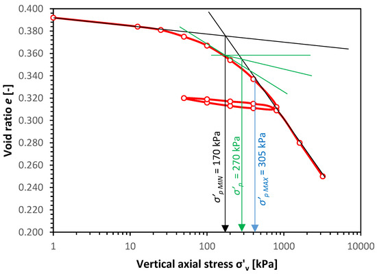 The oedometric test was also conducted in order to find the yield stress. The results presents Figure 4. Based on Casagrante’s method, the yield stress or pre-consolidation stress σ’p was estimated. Three points were specified namely the minimum pre-consolidation stress σ’pMIN, the maximum pre-consolidation stress σ’pMAX and σ’p. Such procedure is important since the compacted soils have the pre-consolidation stress but the exact value is hard to find. The value of σ’pMIN is equal to 170 kPa, the value of σ’p = 270 kPa and the value of σ’p MAX is equal to 305 kPa. The conclusion can be drown, that the compacted cohesive soil in optimal moisture content with respect to Proctor’s method have pre-consolidation stress and therefore, the soil tested in this article in σ’3 = 45 kPa conditions is in pre-consolidated state.