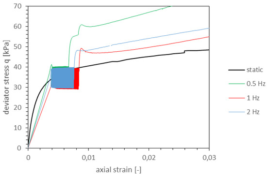 The first step of the test was cyclic triaxial test. The maximal value of deviator stress qmax was set to 40 kPa, afterwards samples were unloaded to qmin = 30 kPa. Cyclic loading triaxial tests were performed in a consolidated-undrained (CU) one-way loading manner, a sinusoidal waves were used (average deviator stress qm was equal to around 35 kPa and deviator stress amplitude qa was equal to around 5 kPa). The load acting on a soil was applied in a vertical direction. To determine, whether the frequency of cyclic load affects the cohesive soil reaction, tests were conducted under three frequency conditions: f = 0.5 Hz, f = 1.0 Hz and f = 2.0 Hz. The number of cycles each time was N = 20,000. During the test the initial σ’3 was equal to 45 kPa. The value of σ’3 was set based on the test results concerning horizontal stress responses of subgrade subjected to one passage of two-axle truck. The 70 cm wheel caused in this case 690 kPa. The horizontal pressure in all three cases of the test was less than 45 kPa at the distance 300 cm from pavement edge and between 40 and 60 kPa 100 cm from the pavement edge [34]. Based on this tests results we decided to set the σ’3 value to constant 45 kPa.