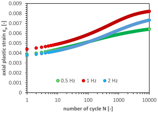 The cyclic loading in further cycles (N > 2 and N < ~1000) was in logarithmic manner in all three cases. Next, the intermediate state was observed where the rate of plastic strain accumulation was steadily decreasing. The last stage (N > 5000) characterizes itself with lower rate of plastic accumulation and again with logarithmic increase of this phenomena. The presented number of cycles is comparative. The slight differences between total accumulated plastic strain is due to amount of plastic strain accumulated in the first cycle. This occurrence can be explained by difference between void ratio e which also refers to lower density in case of the sample tested in 1 Hz frequency conditions.