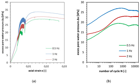 The excess pore water pressure development in all three cases had the same scenario. In the first phase, the excess pore water pressure rises to maximal value Δumax which is equal to 19.5 kPa, 27.0 kPa and 23 kPa respectively. The Δumax value was reached after around 395, 205 and 630 cycles. Further cyclic loading lead to decrease of excess pore water pressure. This behaviour lasted until cycle from 3000 to 6000. Subsequently, the excess pore water pressure reached steady characteristics and the Δu change was limited. On the Figure 8a, the Δu value is presented versus axial vertical strain development. Shape of this characteristics are close to the characteristic which was presented on Fig, 8b. This characteristic was presented in logarithmic scale of number of cycles. This means that, the excess pore water pressure characteristics have impact on the accumulation of the plastic strains. This can also explain why lower frequencies resulted in lower accumulation of vertical plastic strains. Lower value of excess pore water pressure in case of cyclic triaxial test in frequency 0.5 Hz results in lower accumulated plastic strain because the Δu value was lower in comparison to the tests in higher frequencies.