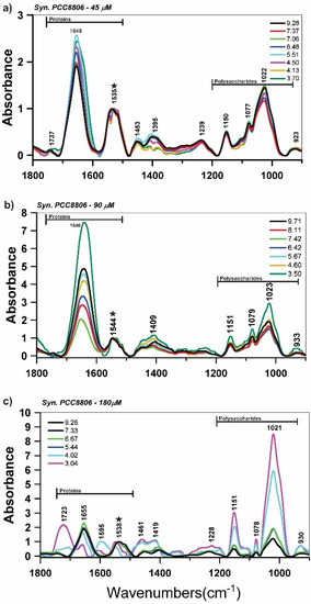 A qualitative analysis of the ATR-FTIR spectral data (Figure 1) indicated that several FTIR bands were dependent on the solution pH within the spectral regions related to polysaccharides (900–1200 cm−1) and proteins (1700–1500 cm−1). For Syn. PCC8806, the spectral variation with pH was mostly observed at ~1022 cm−1 (vC–O–C of polysaccharides), ~1150 cm−1 (v(CO) of the C–O–C glycosidic bridge). We also observed the spectral variations at ~1737 and ~1723 cm−1 (C = O) and ~1395 cm−1 (vC–O), which reflected the deprotonation of carboxylic acid groups (Figure 1).
