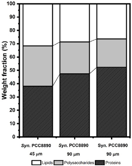 Solving this system of equations provided the proportion of carbon associated with each molecular constituent: (CPs/C), (CPt/C), and (CHC/C). We converted these proportions into weight fractions, using the carbon concentration of each constituent [31]. The lipid composition of the cell envelope was similar between strains, but it tended to decrease with the increase of P in the culture media (Figure 2). This decrease was accompanied by changes in the weight fraction of proteins and polysaccharides. The dominant macromolecules of the Syn. PCC8806 cell envelope were proteins, and their weight fraction tended to increase with P in the media (Figure 2, Table 2). Quantitative variations of the functional groups associated with carboxylic functions C–(O,N)/C (286.3 eV) and O = C, P = O or P–O–P (531.3 eV), and hydroxide (C–OH) or (C–O–C) (532.7 eV) were observed [31,32,34]. The discrepancy between these bands in the different cells was mostly noted in Syn. PCC8806 at P = 90 μM.