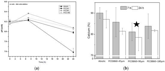 (a) Dynamics of pH in the abiotic conditions and in the presence of Syn. PCC8806 biomass. Data collected after 7 and 24 h. (b) Measured dissolved calcium (%) of the initial calcium concentration at different stages of the experiment (3 replicates). The initial molar concentration of calcium was 2.52 mM. The changes in Syn. PCC8806-90μm solutions were found to be statistically significant: A star indicates this.