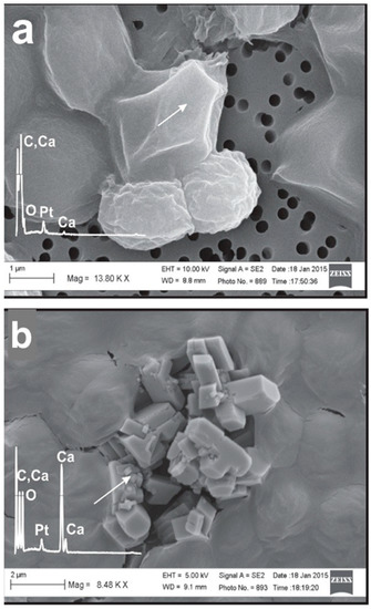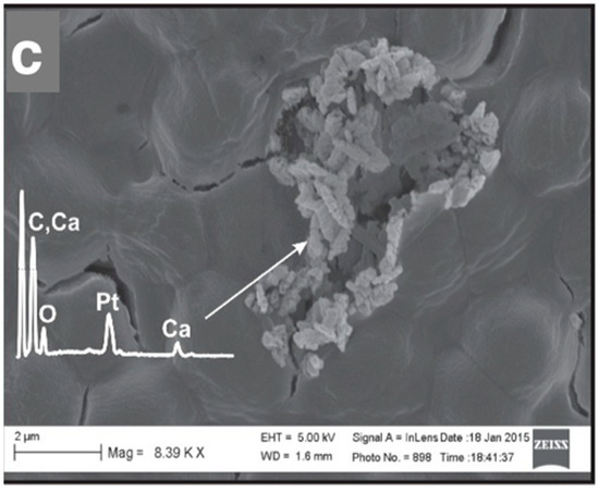 SEM micrographs of the CaCO3 particles formed in picocyanobacteria biomass Syn. PCC8806 at (a) 45 μM, (b) 90 μM, and (c) 180 μM. The energy-dispersive X-ray spectroscopy (EDX) spectra obtained from the precipitates are presented in all images. The platinum (Pt) peak was due to the sputtering with platinum (see “Materials and Methods”). More images and spectra are presented in Supplementary Information Figures S10 and S11.