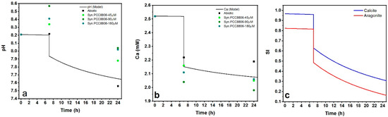 Modeling of the pH and Ca2+ dynamics by PHREEQC (Wateq4f database) [48] during the biomineralization experiments was based on the Plummer, Wigley, and Parkhurst settings (Table 4, Reference [49], Supplementary Information). The calculated pH for the abiotic conditions showed good agreement with the experimental data (Figure 6a). After the initial 7 h of the metastable period, the pH dropped simultaneously with a decrease in [Ca2+] and saturation indices of CaCO3 (reaction (4), Supplementary Information 5, Figure 6b,c). This behavior was observed in all experiments, even though the rates of Ca removal in the experiments with Synechococcus cells differed from those in the abiotic conditions.