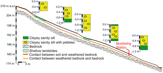 The testsite slope is located in the northeastern part of Oltrepò Pavese (Northern Italy), a hilly region corresponding to the northern termination of the Apennines (Figure 1). In this area, medium-lowpermeability arenaceous–conglomeratic bedrock, including the Monte Arzolo Sandstones and the Rocca Ticozzi Conglomerates, overlies impermeable silty–sandy, marly bedrock (Sant’AgataFossili Marls).The bedrock strata are sub-horizontal and dip east–northeast. The medium-low hydraulic conductivity of the arenaceous–conglomeratic bedrock is linked to its low primary porosity and to the limited number of fractures, which prevent the development of high secondary hydraulic conductivity. Deep-water circulation is thus confined in levels of less cementation or more fracturing at various depths in the bedrock. In the area surrounding the monitored slope, these levels correspond to horizons of poorly cemented gravels, sands, or conglomerates, with limited lateral extension and thickness between 0.2 and 1.0 m. These bodies are more widespread where the bedrock corresponds to the Rocca Ticozzi Conglomerates or the Monte Arzolo Sandstones and are rarer in the Sant’AgataFossili Marls. These bodies do not appear to constitute a continuous, more permeable level that can form a deep aquifer. The presence of water can be identified only in correspondence with the more permeable levels as isolated bodies.