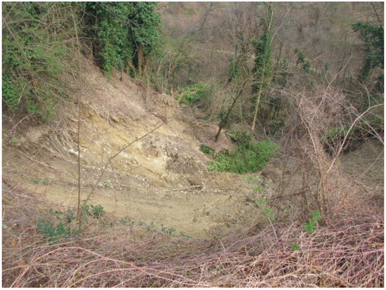 The testsite slope is representative of a wider area characterized by a high density of shallow landslides (Figure 1 and Figure 2). The first and more significant event in terms of the number of triggered landslides occurred on 27–28April 2009. An extreme rainfall of 160 mm in 62 h was measured at the Cigognola rain gauge by the private Cooperative of Oltrepò Pavese Viticulturists—COPROVI (Figure 1) [22]. This extreme rainfall triggered more than 1600 shallow landslides throughout the entire Oltrepò Pavese area [12,22]. The highest density, 51 landslides per km2, was registered in the area surrounding the testsite slope.