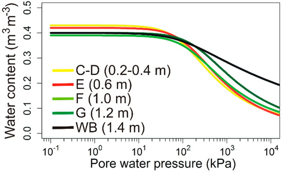The hydrological properties of the various horizons were determined through laboratory reconstruction of SWRCs and HCFs (Figure 5). These functions were reconstructed by using a combination of the Wind–Schindler method (WSM; [28]), including the Hyprop instrument (UMS GmbH; Munich, Germany), and the vapor pressure method (VPM; [29]), including the WP4T device (Decagon Devices; Pullman, DC, USA) on the undisturbed soil samples. The experimental data were fitted through the models of [27,30]. The parameters of these models, including the saturated water content θs, the residual water content θr, the fitting parameters α and µ, and the saturated hydraulic conductivity Ks were then estimated by using the Marquardt algorithm [31]. Although the drying–wetting hysteresis phenomenon of these soils has been deeply investigated elsewhere [24,32], for the purposes of the present work, it has been neglected and the mean values of the Van Genuchten and Mualem parameters have been assumed. All of the soil levels had similar mean values of α (0.007–0.013 kPa−1) and θr (0.01–0.03 m3m−3; Table 2). The µ and θs parameters were slightly higher until the depth of 0.6 m. Moreover, Ks was quite steady around 1 ×·10−6 and 2.5 ×·10−6 ms−1, except for that at the soil level at 1.2 m below the ground (G level), which was the lowest permeable soil horizon (5·× 10−7 ms−1; Table 2). The weathered bedrock (WB)level at 1.4 m below the ground had lower values of both Ks (3·× 10−7ms−1; Table 2) and µ (1.15; Table 2) with respect to the soil layers above, although it wascharacterized by similar values of θs and θr and a higher value of α (0.050 kPa−1) than those in the soil horizons (Table 2).