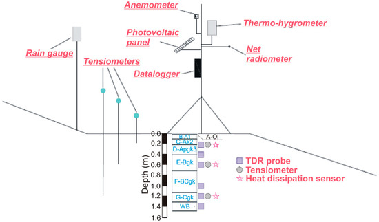 The integrated field monitoring station, installed atthe testsite slope on 27 March 2012, consists of a rain gauge (Model 52203, Young Comp., Traverse City, MI, USA), a thermo-hygrometer (Model HMP155A, Campbell Sci. Inc., Logan, UT), a barometer (Model CS100, Campbell Sci. Inc., Logan UT, USA), an anemometer (Model WINDSONIC, Campbell Sci. Inc., Logan, UT, USA), and a net radiometer (Model NR-LITE 2, Kipp&Zonen, Delft, the Netherlands; Figure 6). The meteorological sensors were linked to six time domain reflectometer (TDR) probes (Model CS610, Campbell Sci. Inc., Logan, UT, USA), installed at 0.2, 0.4, 0.6, 1.0, 1.2, and 1.4 m belowthe ground surface, to measure the water content of the soil at various soil levels and that in the weathered bedrock (Figure 6). Moreover, a combination of three tensiometers (Model Jet-Fill 2725, Soilmosture Equipment Corp., Santa Barbara, CA, USA) and three heat dissipation (HD) sensors (Model HD229, Campbell Sci., Logan, UT, USA) were installed at 0.2, 0.6, and 1.2 m belowthe ground level in various soil horizons to measure the pore water pressure [24].
