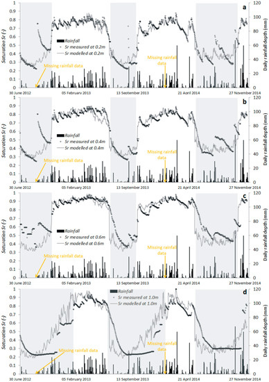 The arbitrary assumption of varying the input model parameters in correspondence with the selected dates implied that the modeled Sr values underwent a sudden decrease (increase) at the beginning of dry(wet) season with respect to the previous trend. Although this assumption wasnot consistent with the measured degree of saturation, particularly at −0.6 and −1.0 m belowthe ground level (Figure 7c,d), the roughness of the model made it necessary. Two main aspects can be highlighted. The first addresses the poor correspondence between the measured and calculated values of Sr during the first phase of the drying period, particularly for points at depths of −0.6 and −1.0 m.